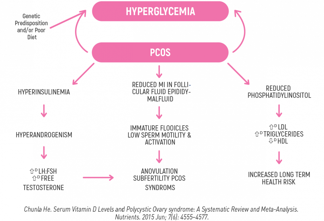 Impaired glucose tolerance affects 30% – 40% of patients with PCOS. Insulin plays a direct role in the pathogenesis of hyperandrogenemia in PCOS, acting synergistically with luteinizing hormone (control ovulation) to enhance androgen production. This is why women with PCOS tend to be overweight or have acne and even growing hair in places they normally would not.
